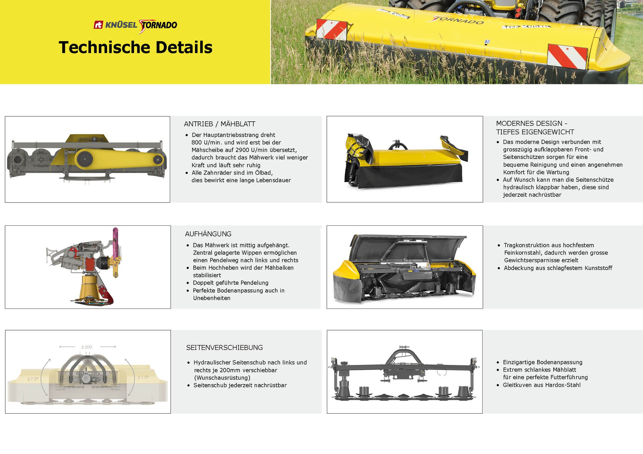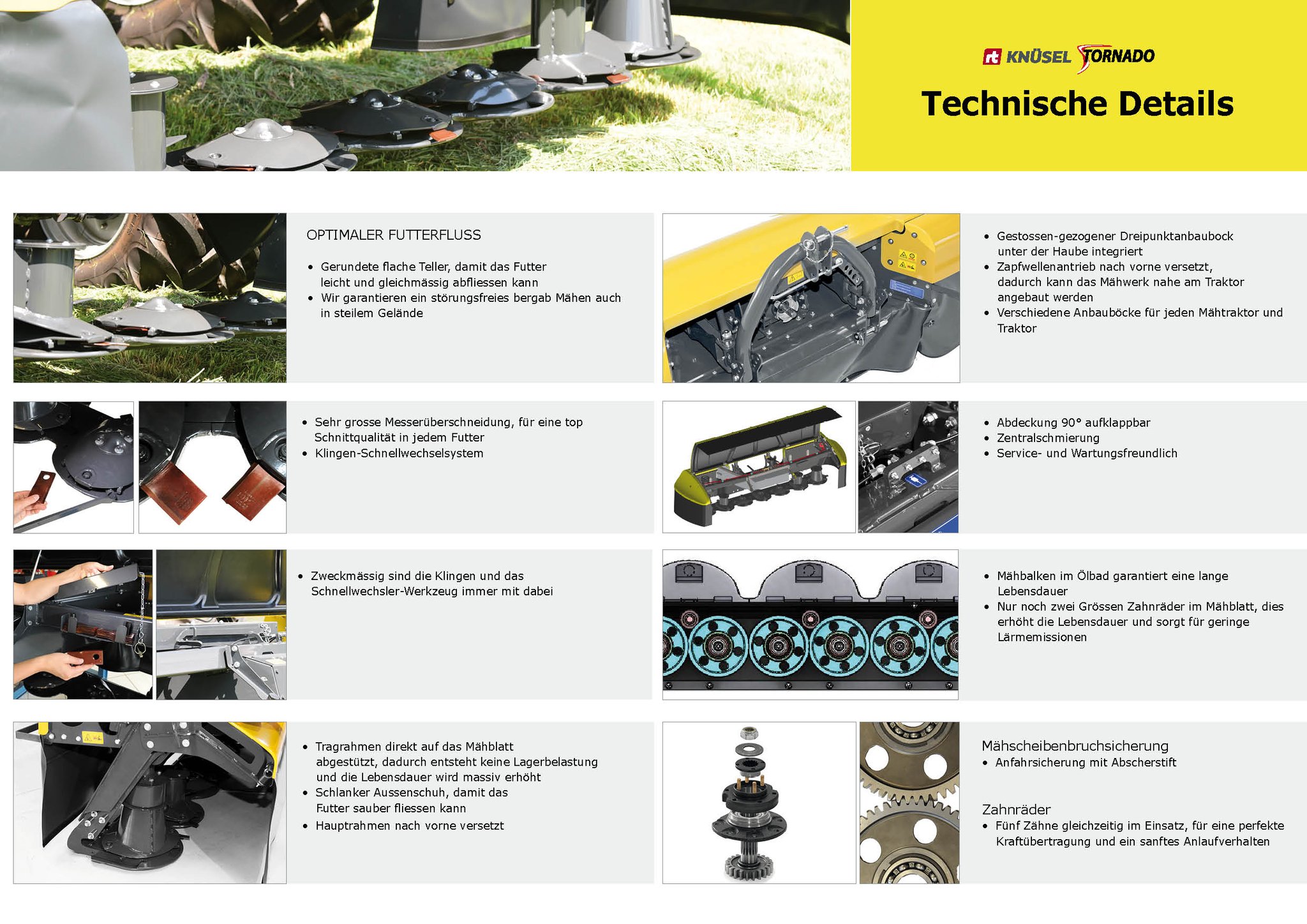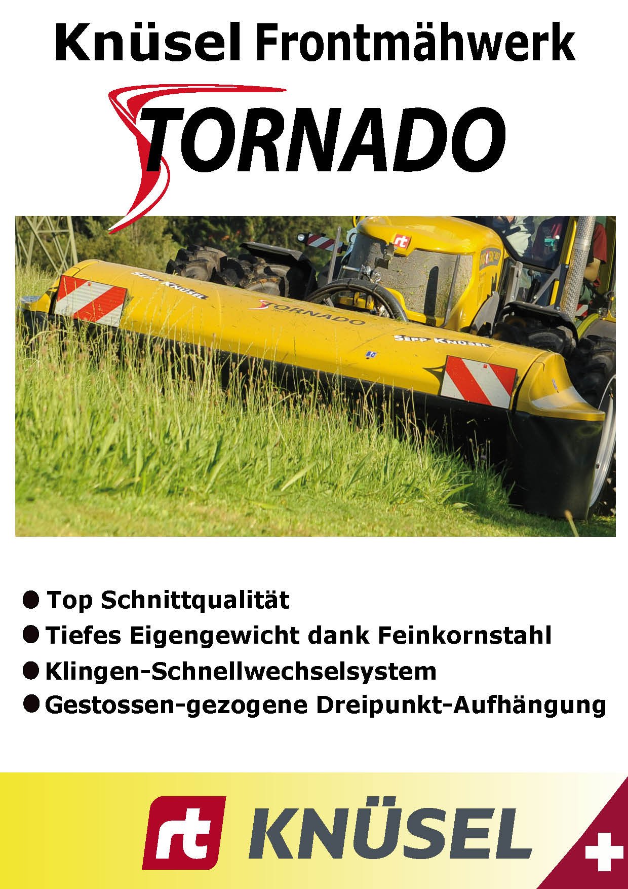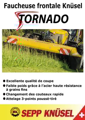 Das Knüsel Scheibenmähwerk Tornado überzeugt durch das tiefe Eigengewicht mit einer einzigartigen Bodenanpassung, dem patentierten gestossenen-gezogenen Dreipunktanbaubock, die top Schnittqualität mit optimalem Futterfluss, die Servicefreundlichkeit durch das Klingen-Schnellwechselsystem und vielen weiteren Vorteilen.