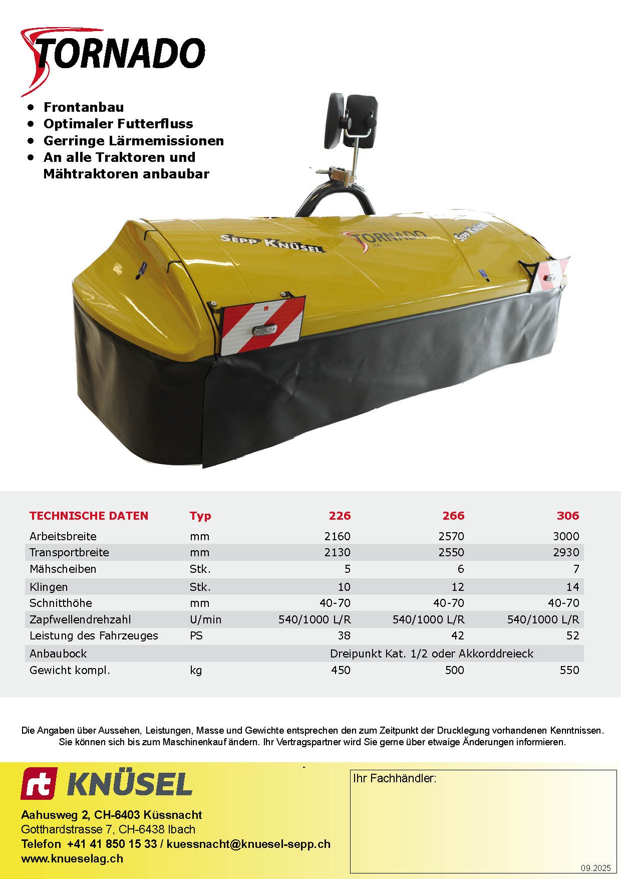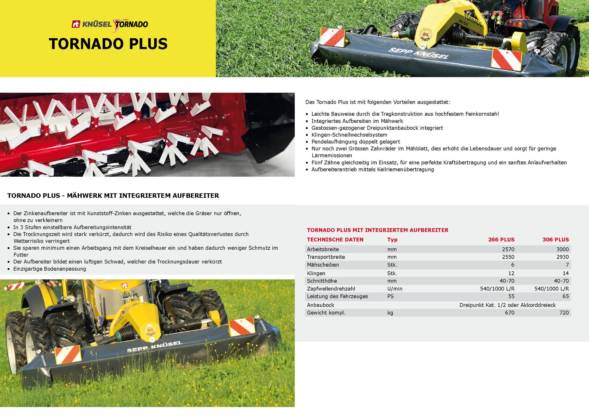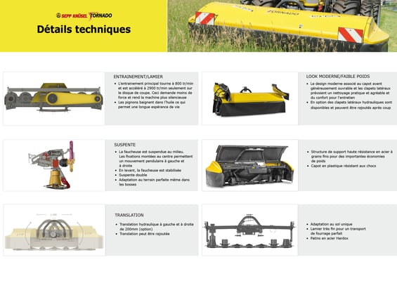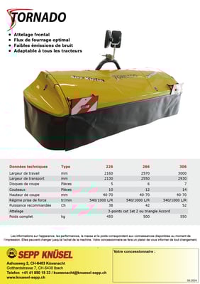 Das Knüsel Scheibenmähwerk Tornado überzeugt durch das tiefe Eigengewicht mit einer einzigartigen Bodenanpassung, dem patentierten gestossenen-gezogenen Dreipunktanbaubock, die top Schnittqualität mit optimalem Futterfluss, die Servicefreundlichkeit durch das Klingen-Schnellwechselsystem und vielen weiteren Vorteilen.